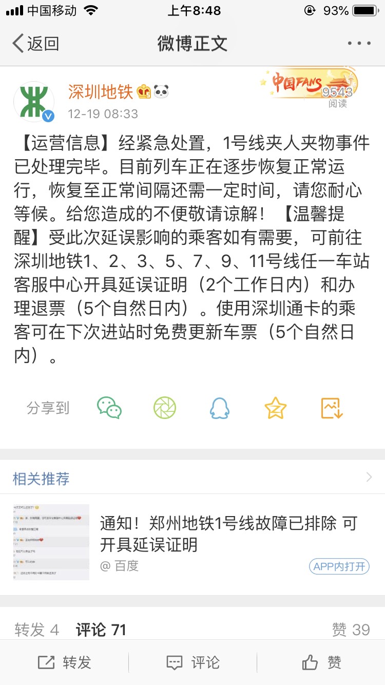 刚刚,深圳地铁官方微博发布消息称,经紧急处置,1号线夹人夹物事件已处理完毕。目前列车正在逐步恢复正常运行,但恢复至正常间隔还需一定时间。受此次延误影响的乘客如有需要,可前往深圳地铁1、2、3、5、7、9、11号线任一车站客服中心开具延误证明(2个工作日内)和办理退票(5个自然日内);使用深圳通卡的乘客可在下次进站时免费更新车票(5个自然日内)。记者也从深圳地铁相关部门了解到,被夹市民已送往医院检查。