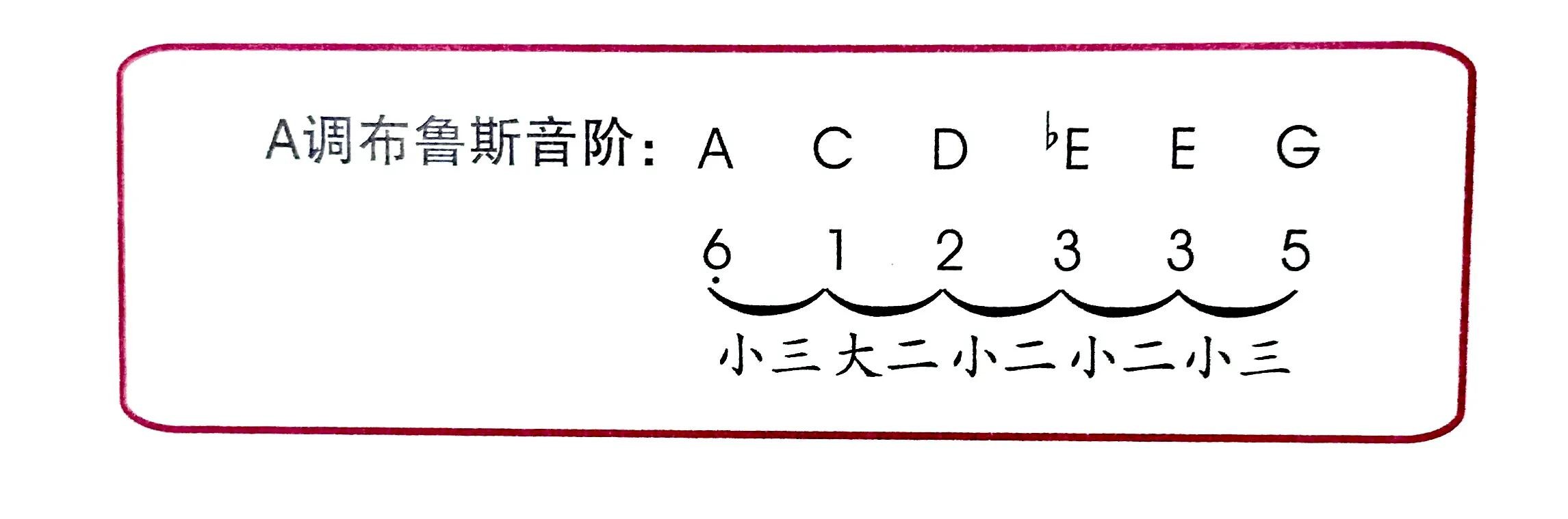 以A调布鲁斯音阶为例,a小调的五声音阶由A、C、D、E、G五个音构成,在这五个音中间加入一个降四级的E,就得到一组A调的布鲁斯音阶。
