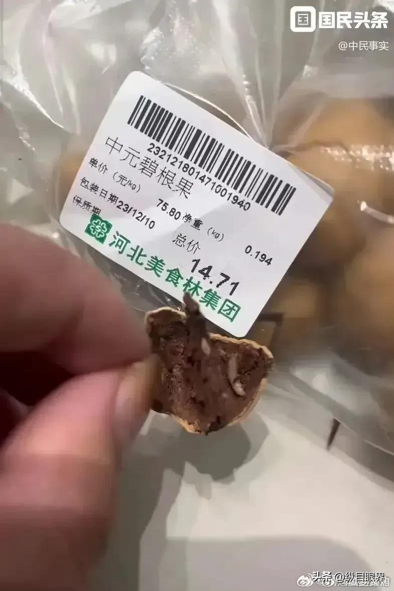 2023年12月10日,有网友反映,河北省邯郸市在美食林超市购买的巴旦木和中元碧根果上发现活虫。