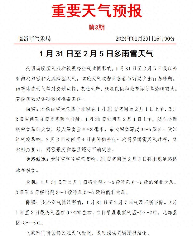 1月29日,临沂市气象局发布重要天气预报:1月31日至2月5日临沂市将有两次雨雪和大风降温天气。