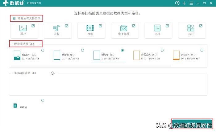步骤一:双击打开软件,在出现的第一个页面中,点击文件类型和要扫描的硬盘,最后单击【扫描】。