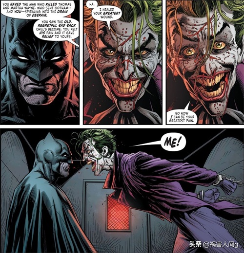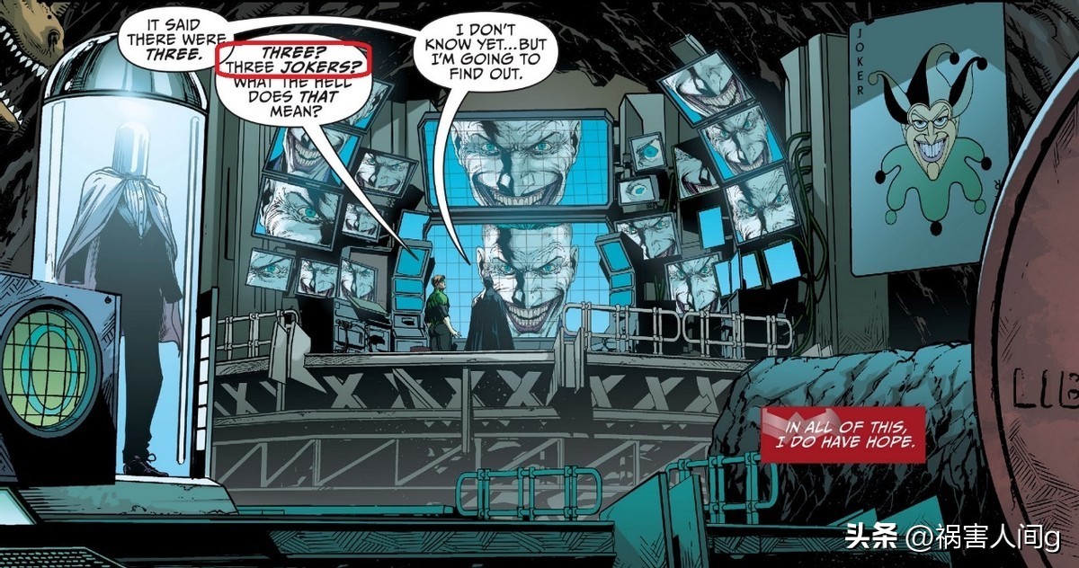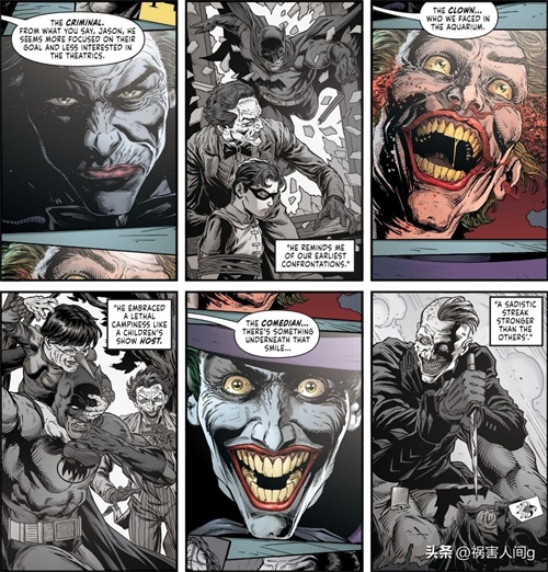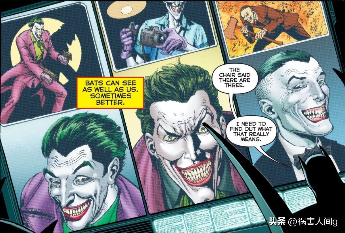 这里先说一下,编剧杰夫.琼斯出现了一个BUG,在上文第二张图中,也就是漫画《DC宇宙重生》中,蝙蝠侠电脑上显示了三个小丑,按理说应该分别是罪犯、丑角和笑客,但是根据漫画《三个小丑》中的剧情,蝙蝠侠电脑上的后两个小丑(致命玩笑小丑和新52小丑)都是同一个人也就是笑客,蝙蝠侠的电脑上并没有丑角。