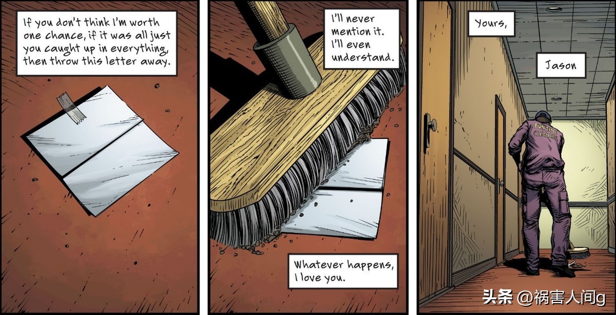 在事件结束之后,杰森写了一封情书,说为了芭芭拉自己可以放弃红头罩的身份,他用透明胶布将情书贴在了芭芭拉的门上,然而,在他走后,透明胶带竟然脱落了,这封情书被保洁扫入了垃圾箱,芭芭拉并没有看到。