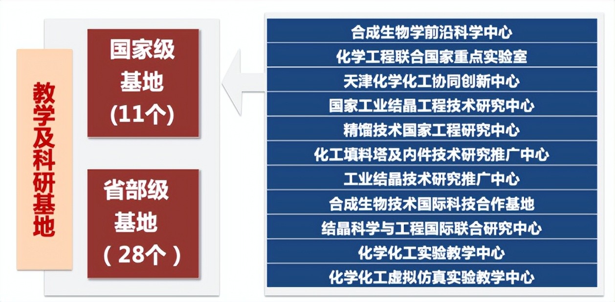 此外,化工学院建设有合成生物学前沿科学中心、化学工程联合国家重点实验室、天津化学化工协同创新中心等11个国家级、28个省部级教学和科研基地。 依托优质的科研平台、雄厚的师资力量,天大化工学院教师除教化育人、培育万千桃李之外,在科研创新方面也收获累累硕果。近年来,学院先后承担多项国家和省部级教改项目,努力发挥学科优势,努力提高学科的科技创新能力,形成了具有明显优势和特色的研究方向。在基础研究领域方面,合成生物学取得了重要的突破,奠定我国在人类基因组化学合成这一领域的国际地位 ;大型填料塔分离技术、医药结晶技术、生物加工技术、新型催化剂与反应技术等多项成果处国际先进水平 ,在相关行业内产生了重要影响,取得了重大的经济效益。