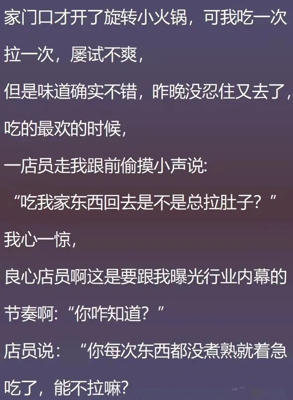 那怪不得总是拉肚子。你都吃没煮熟的东西不拉肚子才怪
