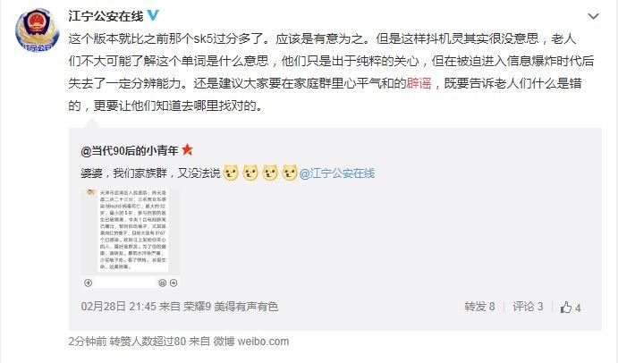 3月1日江宁公安在线辟谣:这个版本就比之前那个sk5过分多了。应该是有意为之。但是这样抖机灵其实很没意思,老人们不大可能了解这个单词是什么意思,他们只是出于纯粹的关心,但在被迫进入信息爆炸时代后失去了一定分辨能力。还是建议大家要在家庭群里心平气和的辟谣,既要告诉老人们什么是错的,更要让他们知道去哪里找对的。