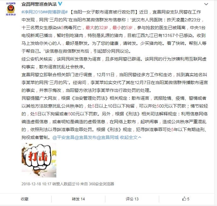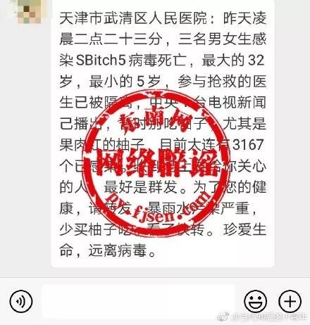 小编查询此类为格式谣言,一般“最大的32岁,最小的5岁”感染各种病毒,各种医院轮流换,各种水果、猪肉、鱼不能吃,各地网警、媒体也都辟谣过,可谓是“变形金刚”病毒,不断辟谣,不断升级,来了一拨又一拨。