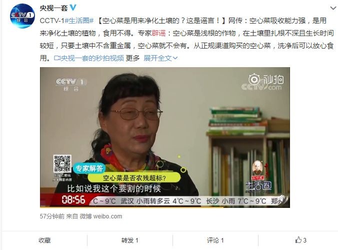 中央一套官方微博今天辟谣:空心菜是浅根的作物,在土壤里扎根不深且生长时间较短,只要土壤中不含重金属,空心菜就不会有。从正规渠道购买的空心菜,洗净后可以放心食用。