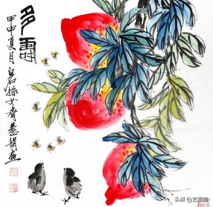 齐慧娟这幅题为《多寿》的作品,有着齐派粗犷、丰厚的意味。红艳的三个大寿桃错落分布,桃子颜色非常高的饱和度,果实丰硕的韵味浓郁。搭配蜜蜂、雏鸡的互动,增加了画面的生活感。
