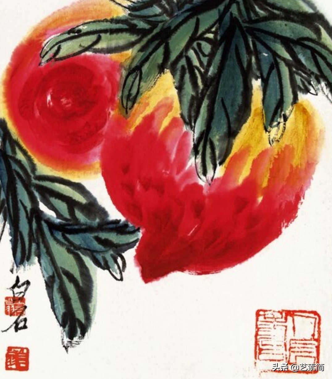 齐白石画桃,用了夸张的手法,桃子、叶子都与现实中的不同。一般学习者,只学到了桃子的厚重、硕大所传达的积年的收获之喜。却忽视了,叶子的浓密和沧桑所传达的年头之长,这些却是齐白石书画笔墨酣畅淋漓的地方。