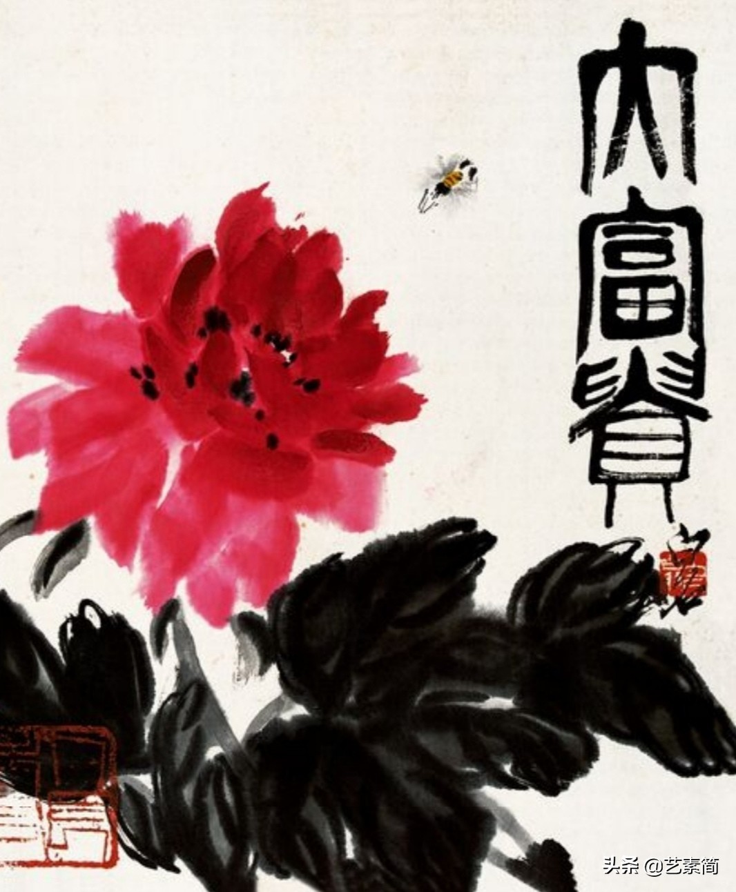 绘画避不开的是牡丹,牡丹硕大的花瓣,是笔墨最难表达的。齐白石、吴昌硕的牡丹在照顾到牡丹花瓣的硕大和层层叠叠的同时,又把笔意表达得一清二楚。主要的是,基本都是用写的方法表现花的各个部位,传达作者的情怀。