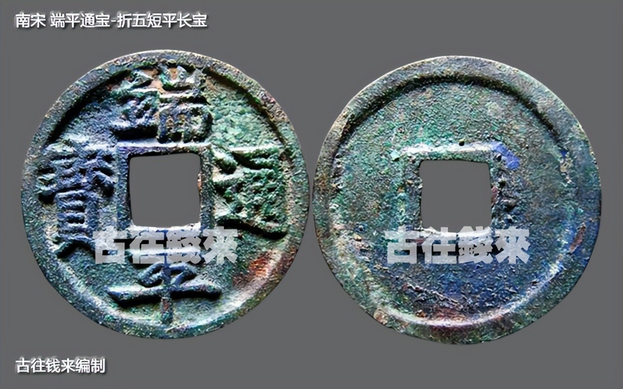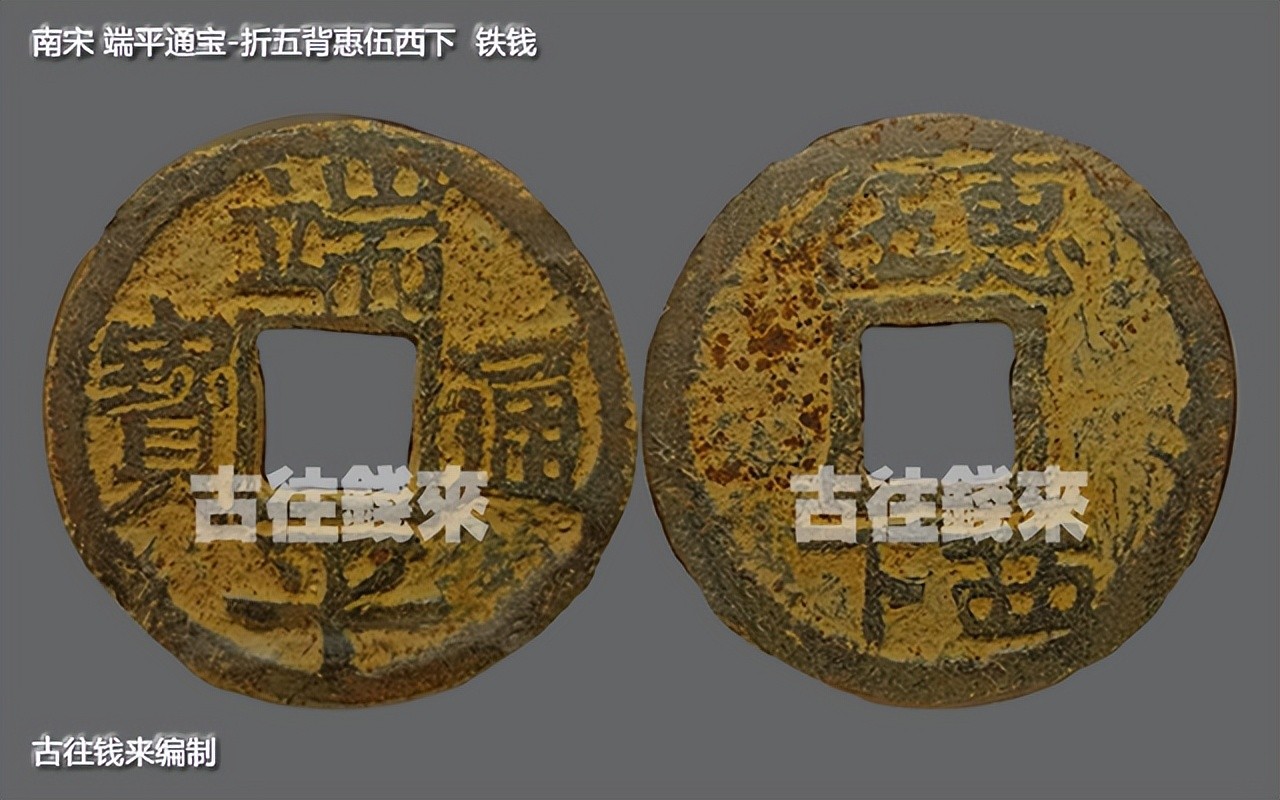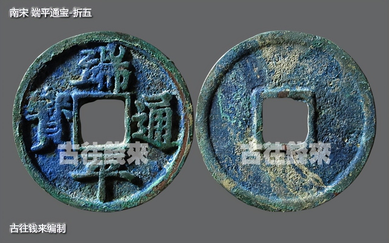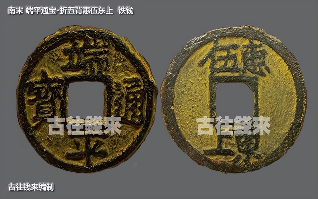 南宋理宗“端平”年间,除铸有“端平元宝”外,还铸行有“端平通宝”钱。此钱铜铁兼铸,铜钱仅见折五型,面文直读光背,铁钱分小平和折五两种,面文直读,钱背有背纪监纪年,另有铁母,极罕。