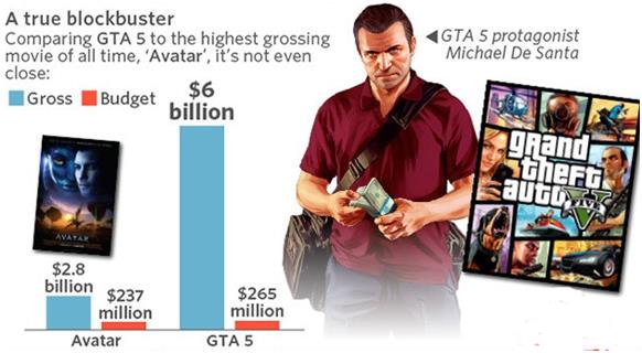 创造影史票房记录的《阿凡达》成本为2.37亿美元,票房收入28亿美元,不及《GTA5》一半;其他的《乱世佳人》、《星球大战》这样的经典电影作品,算上通货膨胀,即使加上分析师估计的10亿美元DVD销售成绩,总收入也才30亿美金,还是无法与《GTA5》比肩。