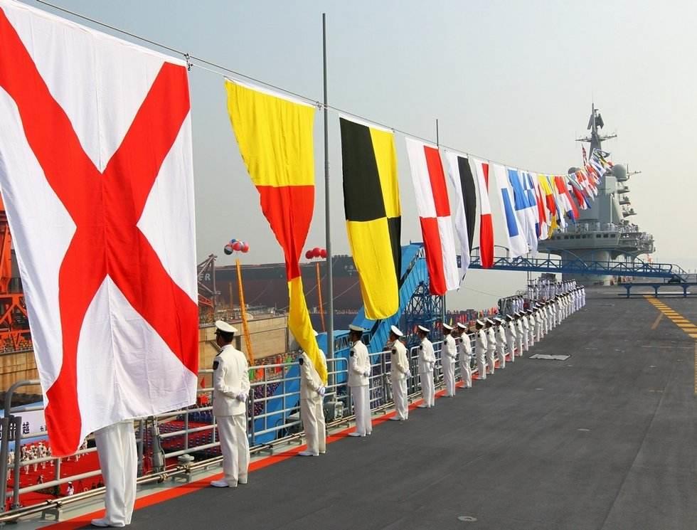 一面或多面旗帜可组成代码,而沟通双方都能查阅代码手册去了解代码的含义。而上图中,我军航母上面悬挂的三面旗帜为“RU1”,代表的含义是:我正在试航。