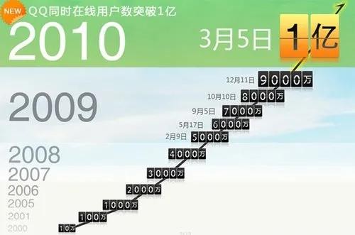 QQ腾讯同时在线人数从0到1亿用了11年的时间,而从1亿到2亿则用了4年。