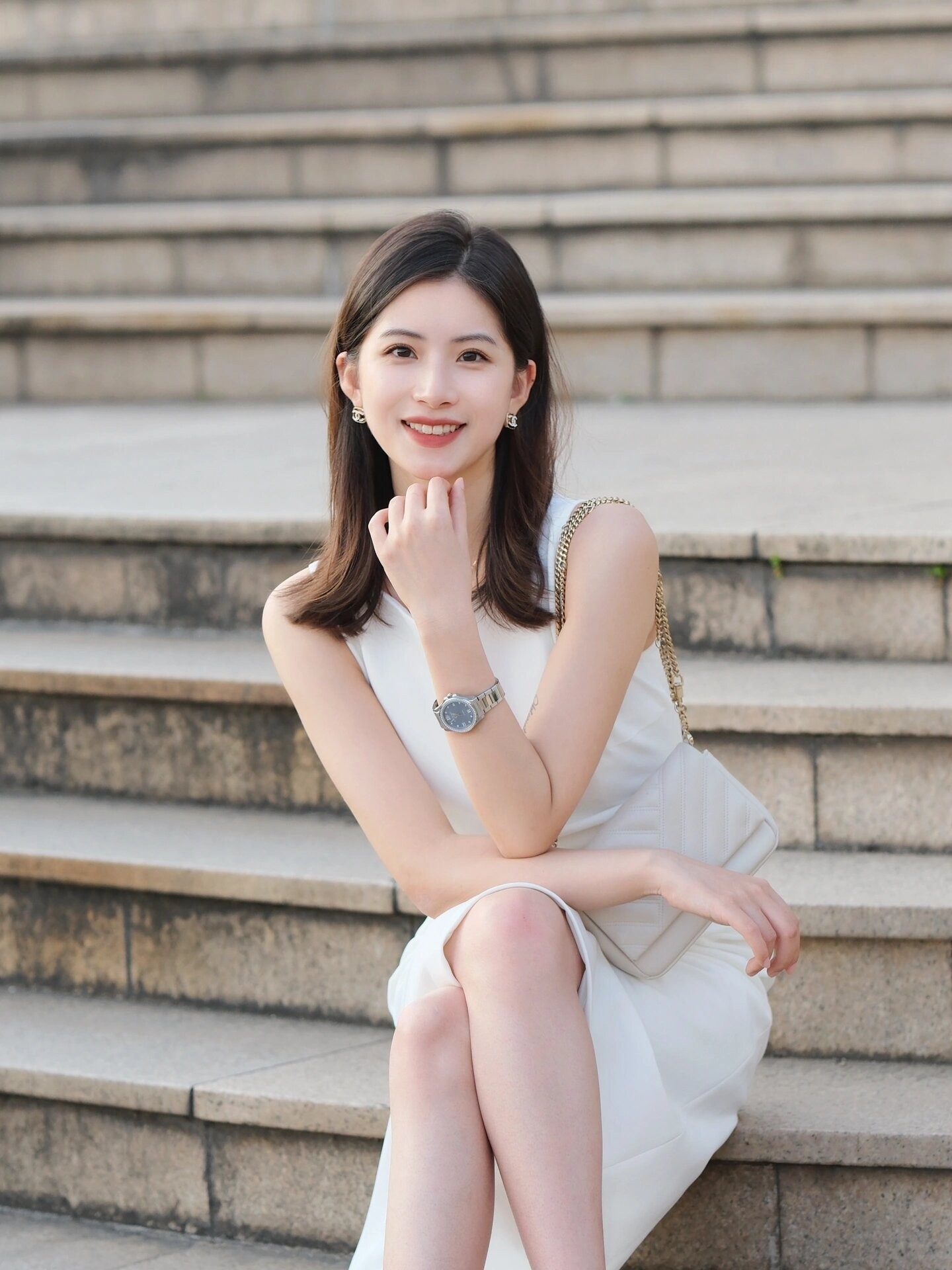 侧站可以更显瘦,同时,笑着看向远方的姿势会让人感觉照片是自然抓拍的。