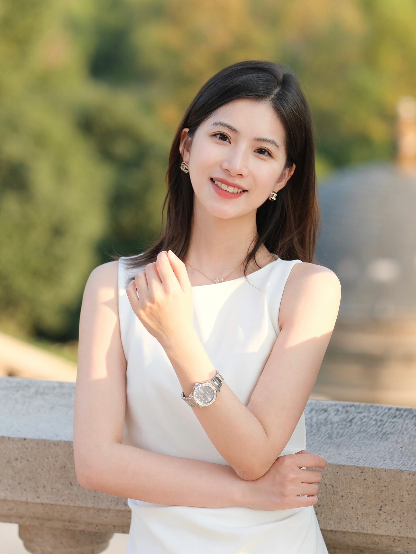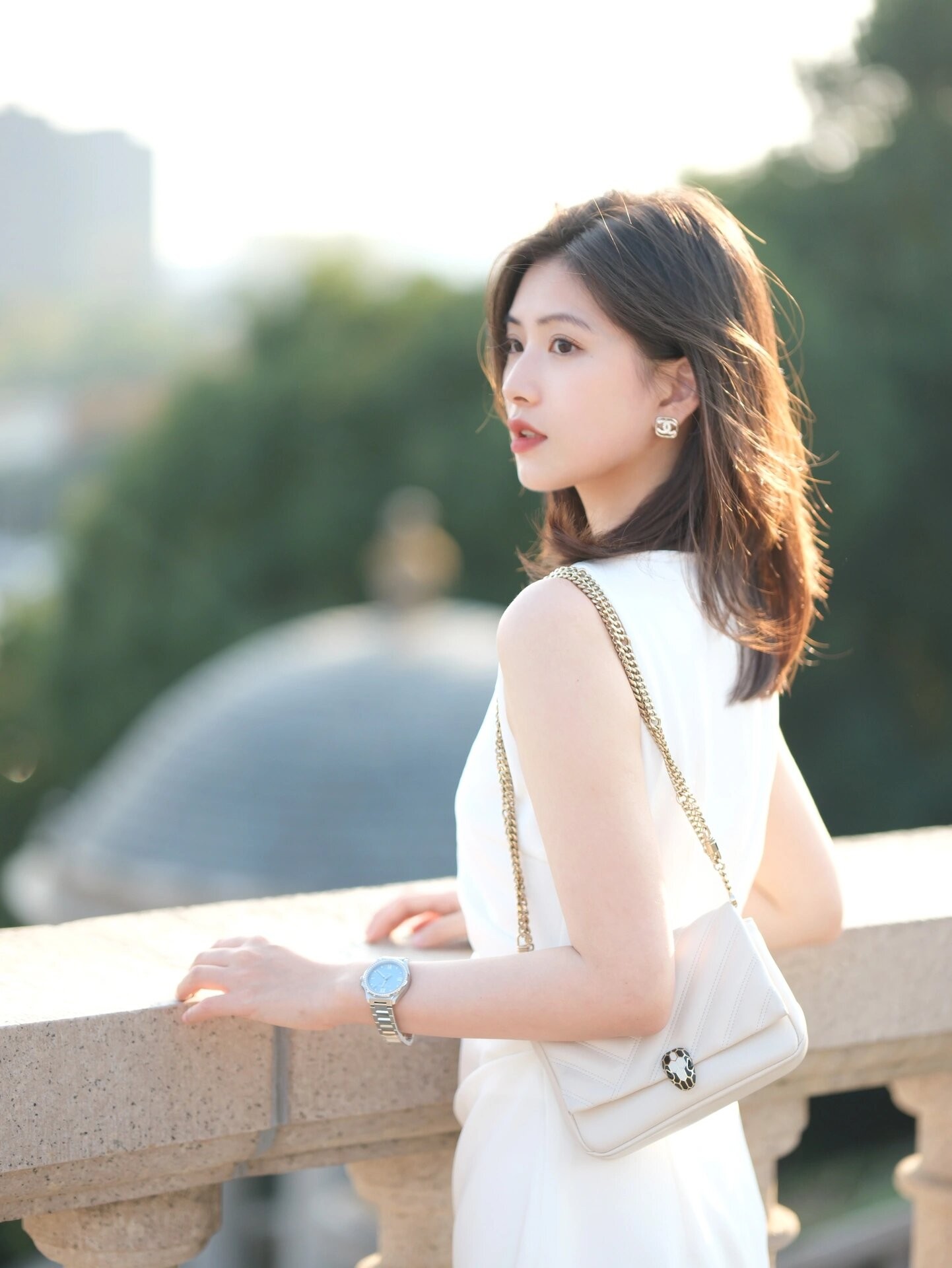 如果不想正面或背影入镜,可以尝试半侧身,手自然放在背后,回头微笑望向一旁,展现自然气质。