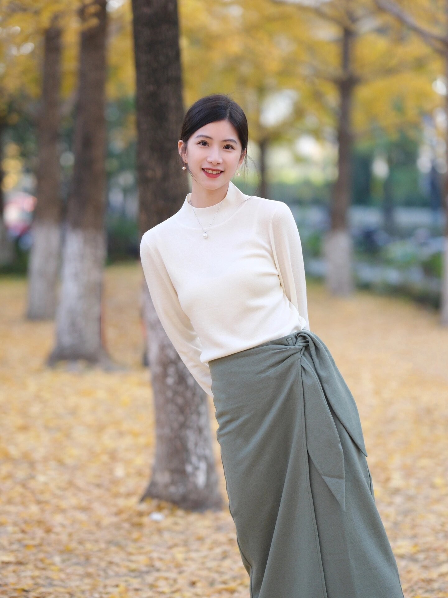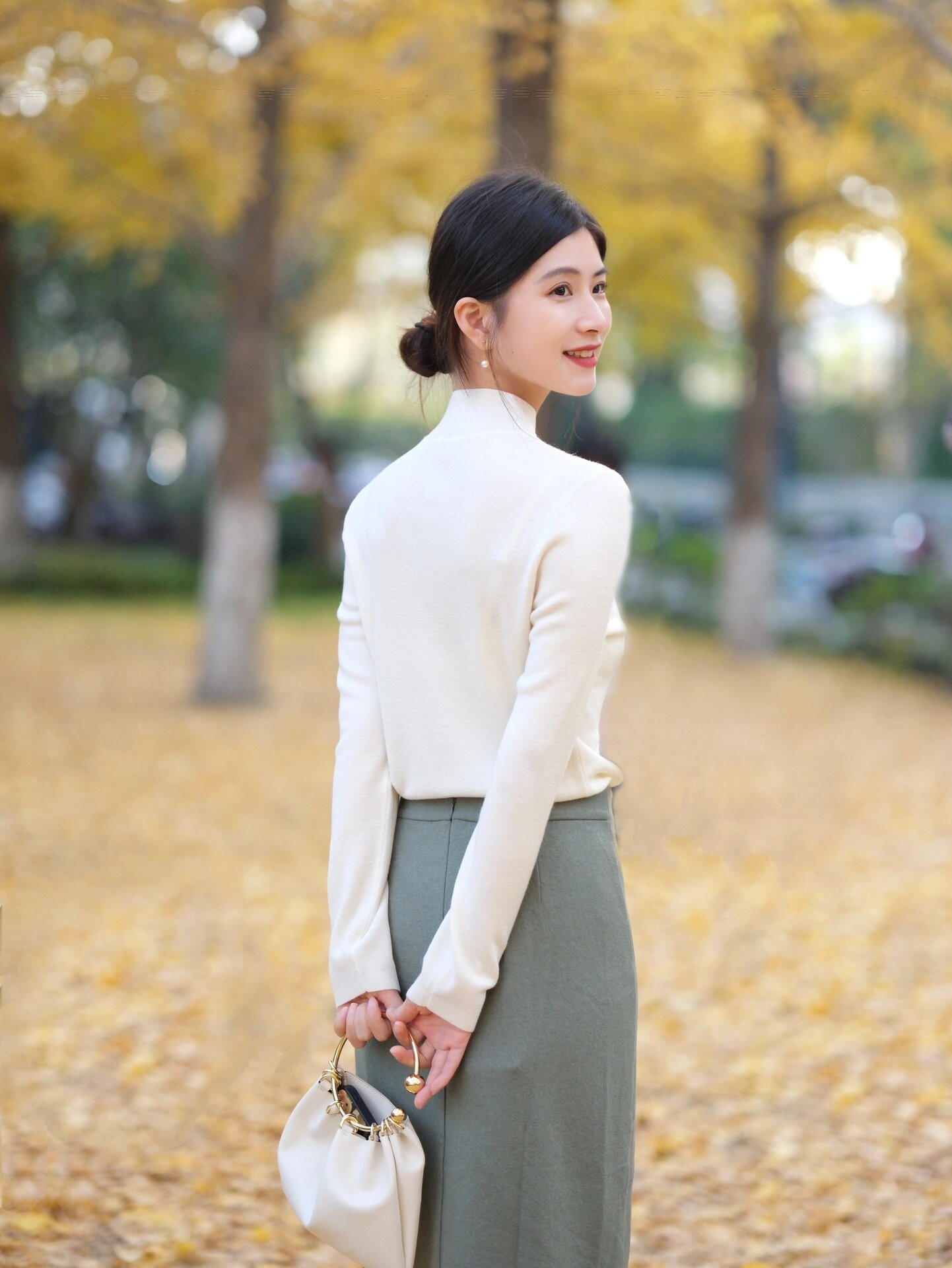 侧身站立,回头望向一旁而非镜头,这样的微笑会显得既轻松又美丽。