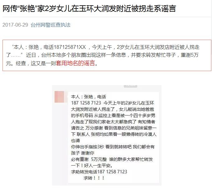我台州网警去年就曾发过“张艳”家2岁女儿在大润发被拐走的辟谣帖。