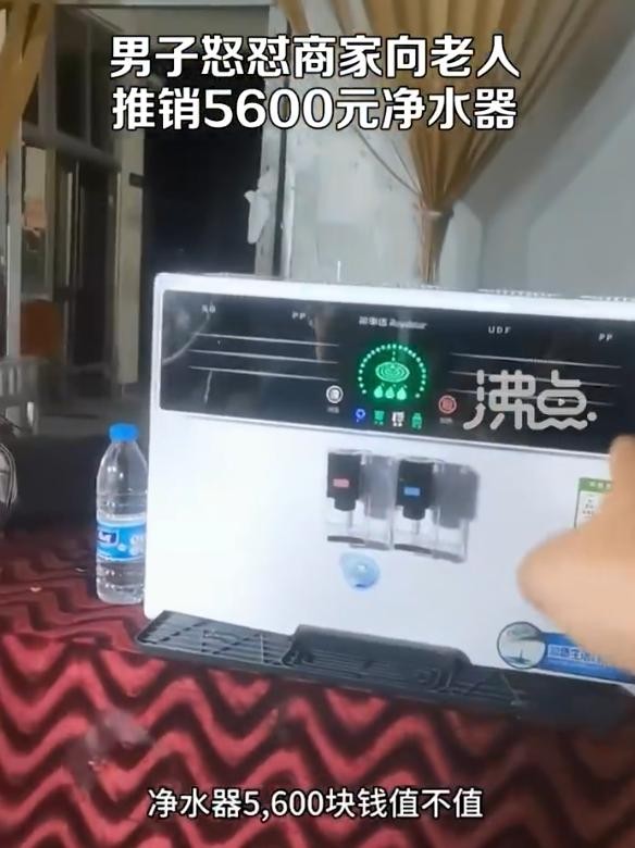 这款“荣事达”净水器标价达5600元。在推销过程中,许多老人对如此昂贵的净水器心生疑虑。一名年轻男子看不过去,当场质问推销人员是否存心欺诈:“我就问你这合不合理,拿这个东西骗老人,这个净水器到底值不值5600元,”。