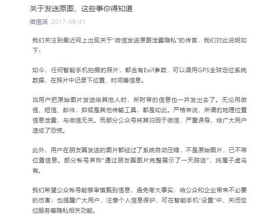 此外,微信强调:朋友圈发送的照片都经过系统自动压缩,不带位置等信息。