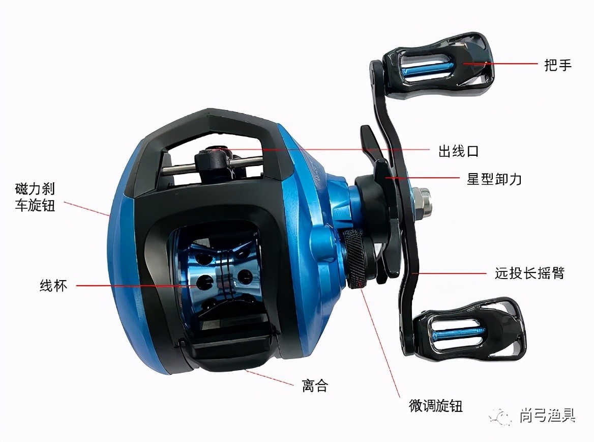 水滴轮主要由主体、线杯、摇臂、刹车、星型扳手、轮脚等组成;相比纺车轮,水滴轮在收放线时时线杯在转动。在左右手选择上,需根据使用单独选择,不能自由互换。