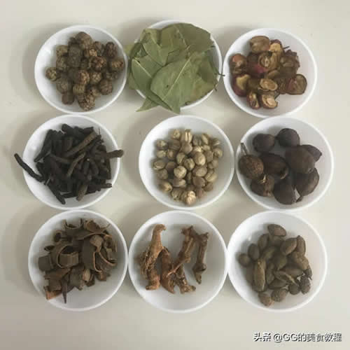 小茴香16克、八角20克、千里香10克、白芷10克、花椒30、丁香5克、草果15克、良姜16克、香茅草10克、积壳15克、罗汉果10克、桂皮18克、香叶15克、白胡椒8克、毛桃10克,草寇16克、荜茇10克