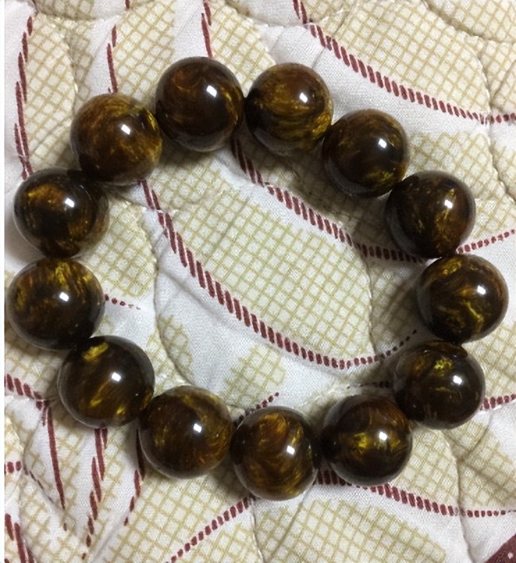 第二类金丝海柳,表面金光闪闪的美,这种本身材质是海柳,但是它是死血柳,它通过泡药水加化学试剂打蜡上色才有这种颜色,不让它本身干巴巴的感觉,这种海柳戴久后会慢慢的掉皮,这玩意也便宜价格不高。