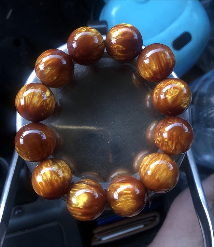 第一类假海柳也是高科技的产物,塑料加上一种铜粉的材质,做出来金光闪闪丝丝缕缕还有水波纹,最关键的时候不怕火烧,质地非常坚硬,某网上卖几十块钱,在景区或地摊常见的假文玩手串之一,成本几块钱好多的话能卖大大几百。