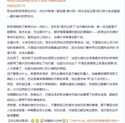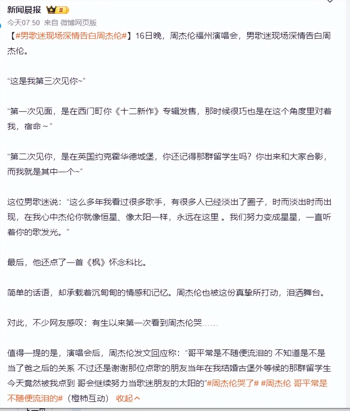 周杰伦福州演唱会被男粉丝真诚告白,周杰伦当场落泪