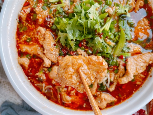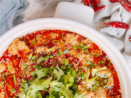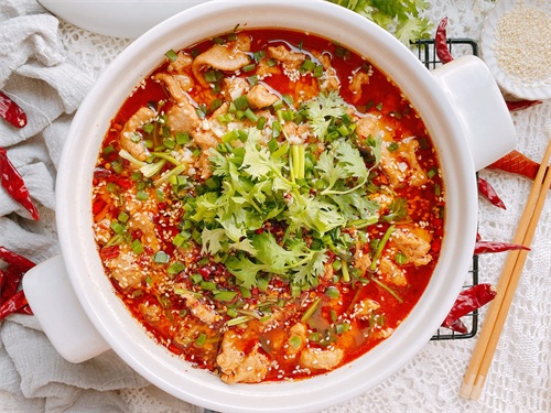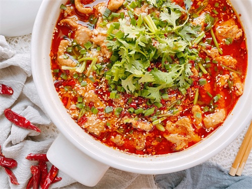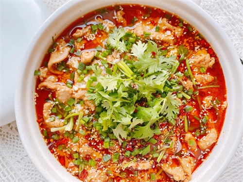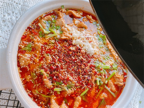 第三步泼油,水煮肉片做好之后,要放上刀口辣椒、蒜末、葱花、香菜和白芝麻,这个时候一定要泼上热油,才能更好的激发出食材的香味,泼油也是有重点的,油温一定要高,7成油温泼上去,这时候食材的香味都被激发出来了;