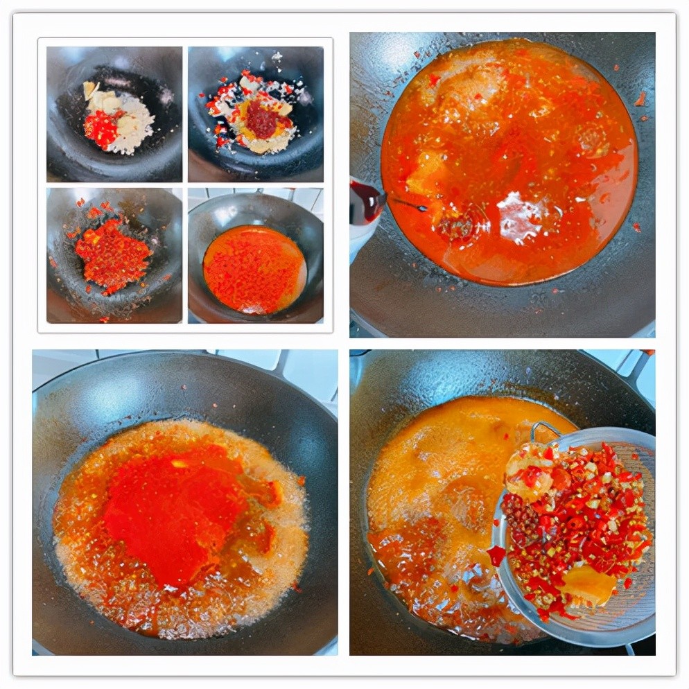 12、锅中再加食用油,加入一部分蒜末、小米辣、花椒、姜片,翻炒出香味,再加入豆瓣酱翻炒出红油,加入适量的清水,大火煮开,煮开之后加少许食盐、生抽、白糖提鲜,大火煮开之后继续煮2分钟;