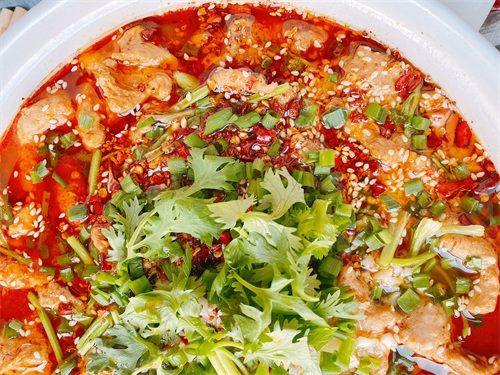 15、最后撒上些葱花和香菜点缀,麻辣鲜香的水煮肉片就做好了,香味四溢;