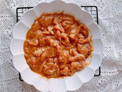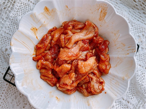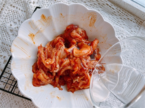 4、搅拌到调料完全混合均匀,加少许清水,500g肉我加了120g清水,清水分3次加入,每次少加一些,搅拌到清水完全被肉片吸收,再加下一次,加入清水能让肉片吃起来更嫩,清水也可以改成葱姜蒜水;