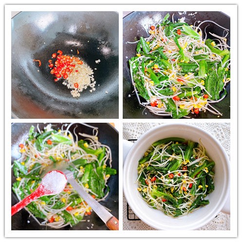 11、炒刀口辣椒的锅里面还有食用油,可以直接炒配菜,加入少许蒜末和小米辣,爆出香味,加入沥干水分的配菜,大火爆炒,把食材完全翻炒熟,加少许食盐增加底味,翻炒到食盐化开,出锅备用;