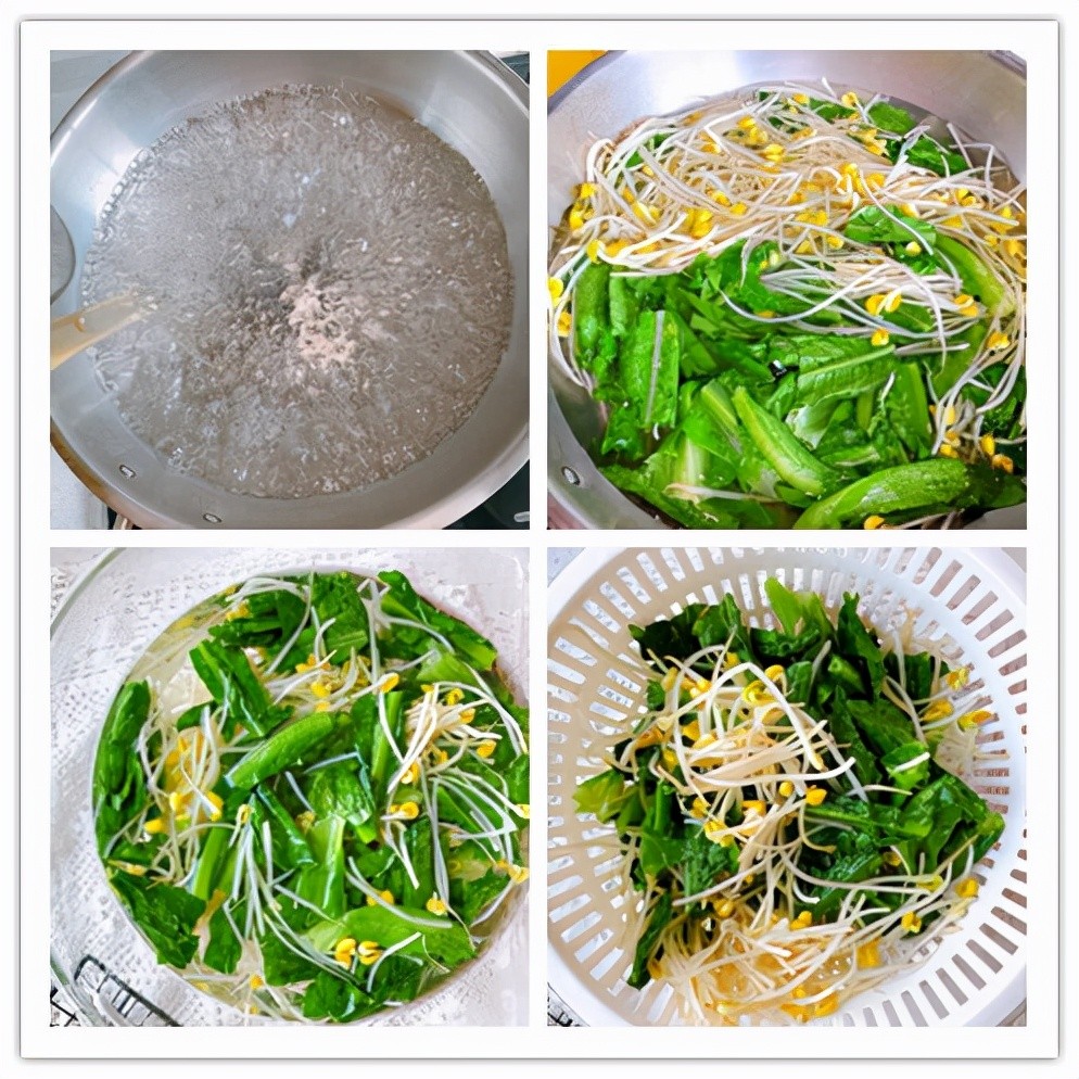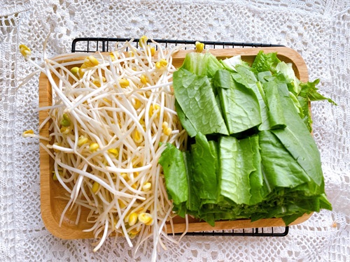9、配菜中的豆芽清洗干净,油麦菜清洗干净切成段,准备焯水;
