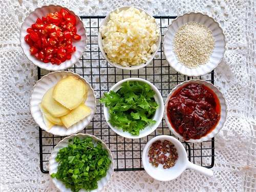 8、准备一些配料,蒜末、姜片、小米辣、郫县豆瓣酱、葱花、香菜、花椒、白芝麻放在一边备用;