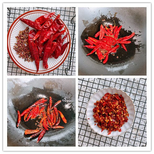 7、现在制作刀口辣椒,锅中加少许食用油,倒入辣椒和花椒,小火翻炒,翻炒到辣椒变色变脆,能闻到香味,出锅,放凉之后,切碎放在一边备用;