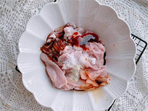 3、肉片开始调味,碗中加入食盐、生抽、蚝油、老抽、料酒、白胡椒、白糖提鲜,抓拌均匀,抓拌均匀之后顺着一个方向搅拌上劲;