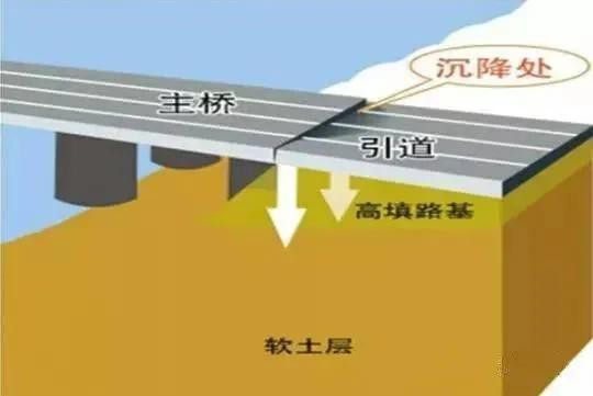 如上图所示,当路基的填料不均匀时,或者如填筑材料的不均匀沉降、刚柔过渡不一致、施工工艺的差异等,都会导致路面沉降。由于桥是由柱子支撑的,沉降没有路面那么明显,两者之间,就形成了差异。一句话总结:就是路基沉降。这在道路工程中,是一种比较普遍,但又不好解决的现象,这也成了道路的主要病害之一。