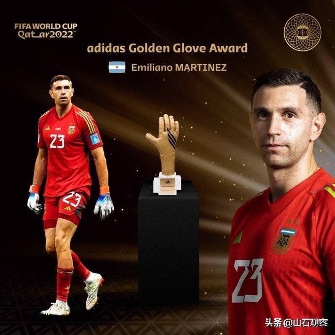 世界杯金手套奖:埃米利亚诺·马丁内斯(阿根廷)马丁内斯本届赛事出场7次,完成3次零封,共计失5球,在对阵荷兰以及法国队的两次点球大战中合计扑出3粒进球。