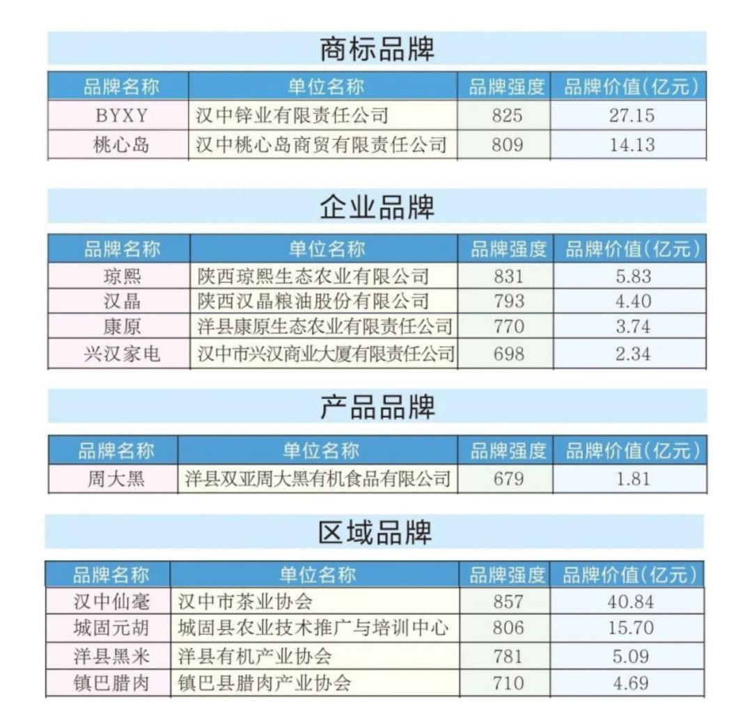 近日,陕西省品牌建设促进中心联合陕西省品牌建设标准化技术委员会发布2024年度陕西省品牌价值评价结果,陕西共82个品牌参评,其中“汉中仙毫”“BYXY”“汉晶”“周大黑”等11个汉中品牌参评,品牌总价值达125.72亿元。