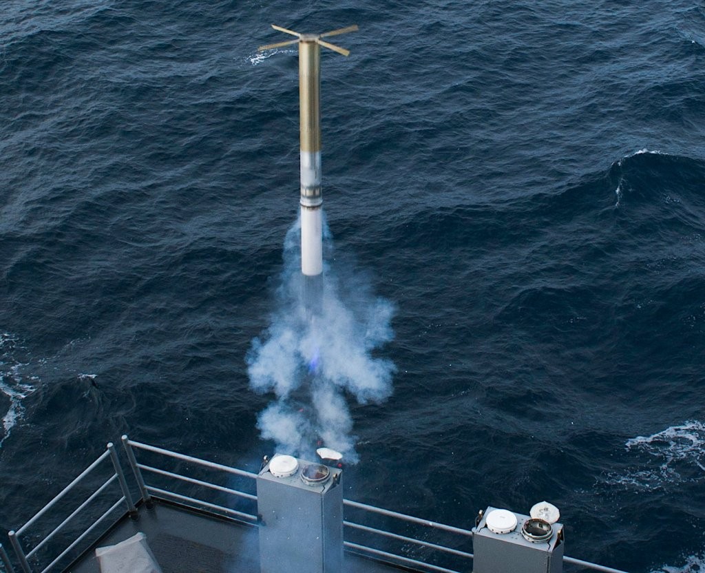 在 “美国” 号两栖攻击舰上进行的 MK 53 诱饵发射系统测试中,一枚 “努卡” 诱饵弹清晰可见。(美国海军)