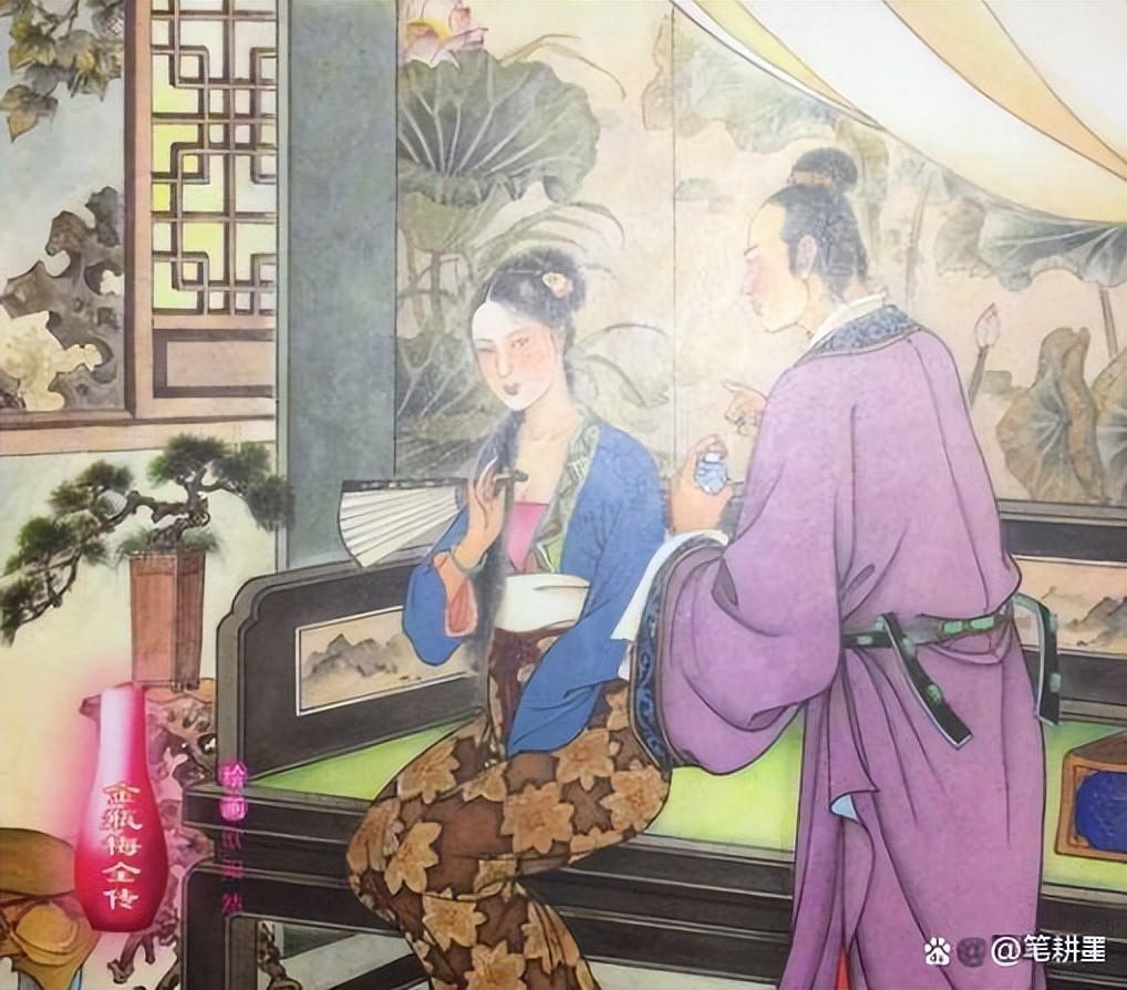 自此为始,西门庆过去睡了来,就告妇人(指潘金莲)说:“李瓶儿怎的生得白净,身软如绵花瓜子一般,好风月,又善饮。俺两个帐子里放着果盒,看牌饮酒,常玩耍半夜不睡。”又向袖中取出一个物件儿来,递与金莲瞧道:“此是她老公公(指花太监)内府画出来的,俺两个点着灯,看着上面行事。”金莲接在手中,展开观看。