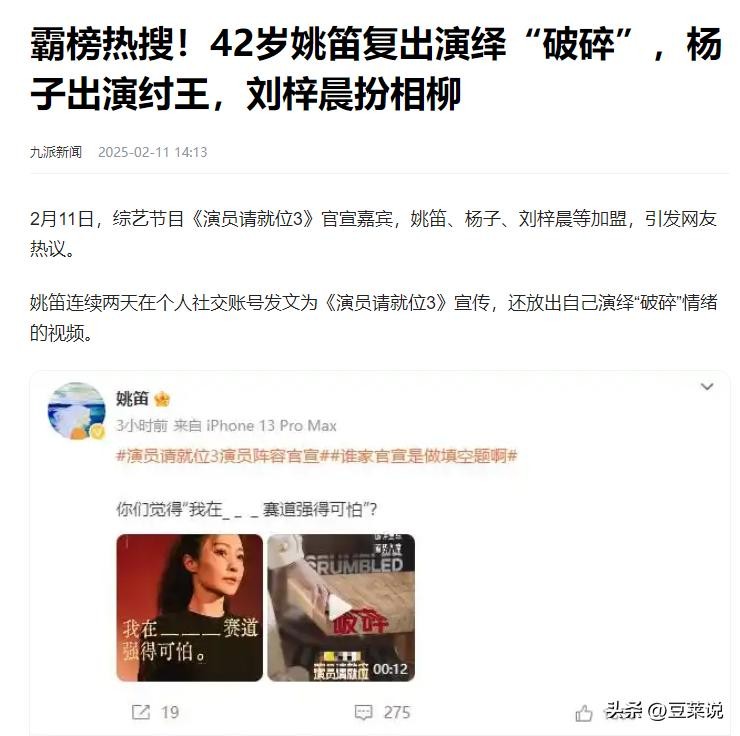 信息来源:九派新闻2025.2.11——霸榜热搜!42岁姚笛复出演绎“破碎”,杨子出演纣王,刘梓晨扮相柳