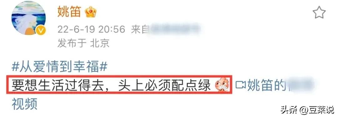 2022年6月,姚笛发布了一条头戴绿色鸭舌帽的视频,配文“要想生活过得去,头上必须配点绿”。