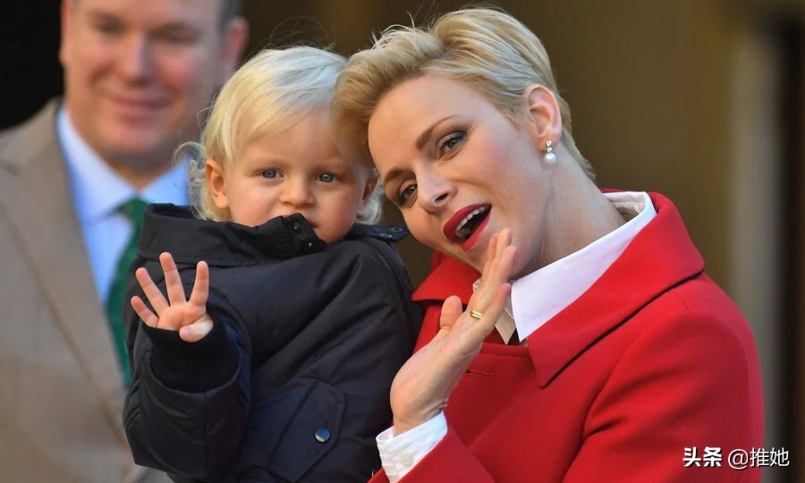 2016年,在摩纳哥皇宫举行的一年一度的圣诞礼物分发会上,摩纳哥王妃夏琳与儿子雅克王子挥手致意。