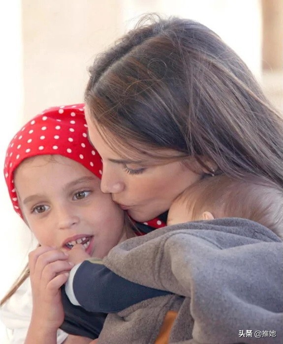 约旦的拉尼娅王后在中紧紧地偎依在两个孩子之间,照片上她写道:“感谢我和这两个孩子分享的所有时刻——2005年,萨尔玛和哈希姆。”