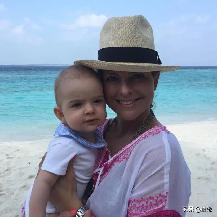 瑞典的玛德琳公主在海滩上和儿子尼古拉王子度假时,在阳光下玩得很开心。