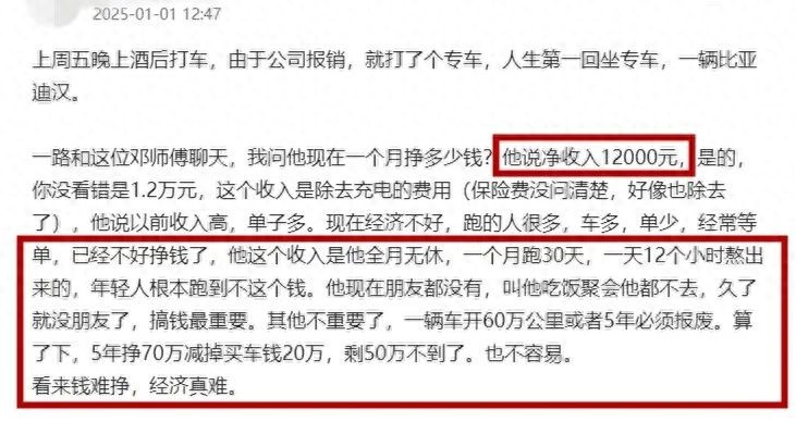 最后,这个乘客简单的给司机算了一笔账,一台车开6年(注:上文中提到的“5年”应该有误)就面临报废,6年的收入大概70万,减去20万的购车款,也就剩下50来万。